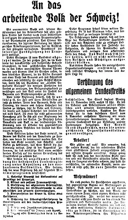 Toutefois, le dimanche 10 novembre, des affrontements se déroulent entre manifestants et militaires sur la place de la Fraumünster de Zurich. Ces échauffourées provoquent une réaction du Comité d'Olten qui appelle à une grève générale illimitée dès le 12 novembre dans l'ensemble du pays[andrey 2]. Le lendemain, jour de la signature de l'armistice, le travail reprend normalement dans l'ensemble du pays à l'exception de Zurich ; dans le but de préparer la grève du lendemain, le Comité d'Olten fait paraître un programme de revendications politiques en neuf points, connu sous le nom d'« Appel du Comité d'Olten »[19].