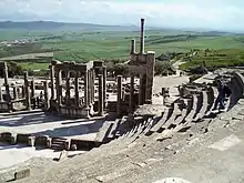 Cette expansion rencontre toutefois des obstacles, en particulier lors du schisme donatiste[35] — conséquence des rivalités de prélats avides d'occuper le siège du primat d'Afrique — qui est condamné de façon définitive à l'issue de la conférence de Carthage, ouvert le [48] et organisé par son plus ardent contradicteur en la personne de l'évêque Augustin d'Hippone. Ce dernier accuse les schismatiques d'avoir coupé les liens entre l'Église catholique africaine et les Églises orientales originelles[48]. En dépit de cette lutte religieuse, la conjoncture économique, sociale et culturelle est relativement favorable au moment du triomphe du christianisme[50], comme en témoignent les nombreux vestiges, notamment de basiliques à Carthage — en particulier celle de Damous El Karita — et de nombreuses églises aménagées dans d'anciens temples païens (comme à Sbeïtla) ou même certaines églises rurales découvertes récemment.