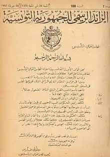 C'est ainsi que la monarchie est abolie par la constituante le [10]. Bourguiba en est désigné président en attendant l'entrée en vigueur de la nouvelle Constitution qui est promulguée le [11].