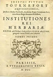 Joseph Pitton de Tournefort (1656-1708) introduit une hiérarchie encore plus sophistiquée de classes, sections, genres et espèces. Il fut le premier à utiliser systématiquement un système polynomial de nomenclature, qui consiste à attribuer à chaque espèce un nom latin composé d'un nom générique et d'une phrase de plusieurs mots décrivant sans équivoque le taxon concerné (phrase de diagnostic)[12],[n 5]. Par exemple, le premier nom de l'« herbe à chat » a été donné sous la forme du polynôme de cinq mots suivant : Nepeta floribus interrupte spiculatus pedunculatis, qui signifie « Nepeta à fleurs en épi pédonculé interrompu ». Le nom binomial actuel de cette espèce est Nepeta cataria. Le créateur de ce système de nomenclature binomiale est Linné[50].