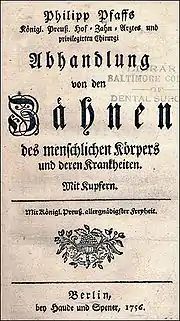 Son pendant a été en Allemagne Philippe Pfaff, dentiste personnel de Frédéric le Grand, qui publie en 1756 le premier manuel de médecine dentaire en allemand : Abhandlungen von den Zähnen des menschlichen Körpers und deren Krankheiten (Traité des dents de l'homme et de leurs maladies). Il y décrit notamment le moulage de la mâchoire au moyen de cire à cacheter où l'empreinte coulée pour la première fois avec du plâtre sert de modèle pour la fabrication d'une prothèse dentaire. En 1840, les Américains L. Gilbert et W. H. Dwinelle accélèrent le durcissement du plâtre en ajoutant des sels et le transforment ainsi en matériau approprié pour le moulage. C'est ainsi que le plâtre trouve une application fonctionnelle de moulage pour les patients édentés[65].