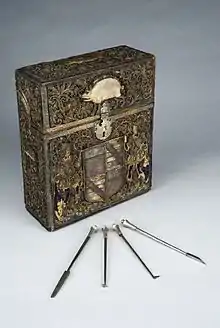 Il découvre aussi que les charlatans garnissent les dents avec de l'étain ou du plomb à bon marché, recouvrent ce métal d'une fine couche d'or, et les vendent comme de coûteux plombages en or[62]. La feuille d'or a déjà été utilisée dans l'espace arabe au VIIIe siècle comme substitut à la dentine. Les premières allusions à la feuille d'or dans l'espace européen comme matériau de plombage pour les dents ne se trouvent qu'au milieu du XVe siècle. Le plombage martelé à l'or dans une molaire est documenté pour Anne-Ursule de Brunswick-Lunebourg en 1601[63]. À cette époque, contrairement à ce qui se fait maintenant, le plombage ne se fait pas avec du métal liquéfié versé, mais est posé par soudage à froid. Ceci repose sur une propriété de l'or très pur de former à sa surface des liaisons atomiques et d'y durcir. La feuille d'or est tassée (condensée) dans la dent avec un petit marteau (d'où le nom). Le plombage martelé à l'or subira une résurgence aux États-Unis au XIXe siècle et s'y conservera jusqu'à présent, parce qu'il représente une technique de restauration épargnant la substance de la dent[64].