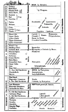 La connaissance des fossiles continua à progresser rapidement au cours des premières décennies du XIXe siècle. Dès 1840, les grandes lignes de l'échelle des temps géologiques sont connues et en 1841, John Phillips nomme trois ères majeures selon la faune dominante de l'époque : le Paléozoïque dominé par les invertébrés et les poissons, le Mésozoïque, l'âge des reptiles et le Cénozoïque avec les mammifères. Cette représentation progressive de l'histoire évolutive du vivant fut acceptée même par les géologues conservateurs comme Adam Sedgwick et William Buckland. Cependant, comme Cuvier, ils attribuèrent la progression à des épisodes successifs de catastrophes et d'extinctions suivis par de nouveaux épisodes de création[46]. Cependant, à la différence de Cuvier, Buckland et d'autres développèrent la théologie naturelle pour établir un lien entre le dernier épisode catastrophique et le Déluge biblique[47],[48].