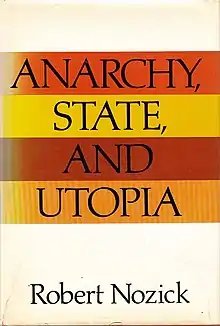 Considérant que Rawls encourage un contrôle gouvernemental excessif et des violations des droits, le libertaire Robert Nozick a publié Anarchie, État et Utopie (Anarchy, State, and Utopia) en 1974. Ce livre plaide pour un État minimal et défend la liberté de l'individu. Il soutient que le rôle du gouvernement devrait être limité à "la protection de la police, la défense nationale et l'administration des tribunaux, toutes les autres tâches habituellement accomplies par les gouvernements modernes - éducation, assurance sociale, bien-être, etc. étant prises en charge par les organismes religieux, les organisations caritatives et autres institutions privées opérant dans un marché libre"[11]. Nozick affirme son point de vue sur la justice fondée sur sa théorie des titres. Selon celle-ci, si chaque membre de la société a acquis ses biens conformément aux principes d'acquisition, de transfert et de rectification, alors tout schéma d'allocation, aussi inégal soit-il, est juste. Selon la théorie de la justice des titres, "la justice d'une répartition est effectivement déterminée par certaines circonstances historiques (contrairement aux théories de l'état final), mais elle n'a rien à voir avec l'ajustement d'un quelconque schéma garantissant que ceux qui ont travaillé le plus dur ou qui sont le plus méritants ont le plus de parts"[11].