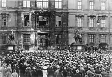 Le , Max de Bade impose à l'Empereur Guillaume II l'abdication, tout en refusant de manière formelle la constitution écrite par Friedrich Ebert avec la chancellerie. Contre l'avis de ce dernier, qui souhaite poursuivre sur une voie purement légale, Philipp Scheidemann proclame la république : « La monarchie, vieille et pourrie, s'est écroulée. Vive la nouvelle république, la république allemande[citation 27] ! ». Presque au même moment, Karl Liebknecht proclame la république socialiste[55].