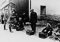 Quand les Allemands entrent à Łomża pendant la Première guerre mondiale, les Juifs espèrent que leur statut social et politique va s'améliorer. Ils font donc un accueil enthousiaste aux troupes allemandes. L'élection du conseil municipal ordonnée par les Allemands est assez controversée, les Juifs sont accusés de trahir la cause polonaise et les Polonais suspectés d'avoir truqué les élections. En , 10 Juifs sont élus au conseil municipal sur un nombre total de 24 sièges[22]. À partir du , le 1er régiment d'infanterie de la Légion polonaise sous les ordres du colonel Edward Rydz-Śmigły est stationné à Łomża, rejoint le par le 4ème régiment d'infanterie dirigé par le colonel Bolesław Roja. Bien que des Juifs de Galicie se soient enrôlés dans la Légion, les habitants juifs de Łomża accusent les soldats polonais de pillage et d'actes de violence[23].