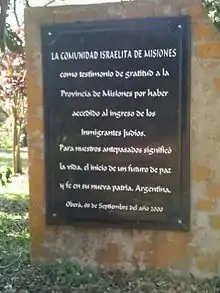 Sous la présidence de Julio Argentino Roca, un décret invitait spécifiquement les juifs russes à immigrer en Argentine, et José María Bustos fut nommé agent du gouvernement argentin en Europe, avec pour mission de stimuler cette immigration. Depuis lors, et face à la grave situation des juifs dans l’Empire russe, les communautés juives d’Europe occidentale, réunies dans l’Alliance Israélite Universelle (AIU), allaient favoriser l’immigration des juifs d’Europe orientale vers l’Argentine, immigration dont le financement serait à charge du philanthrope juif, le baron Maurice de Hirsch. En 1888, huit familles juives d’Ukraine arrivèrent en Argentine lors d’une opération mise sur pied par l’Alliance, et allèrent se fixer à Monigotes, dans la province de Santa Fe. Plus tard viendront les rejoindre cinquante autres familles[17], qui fonderont la colonie aujourd’hui disparue de Colonia de Aronsville.