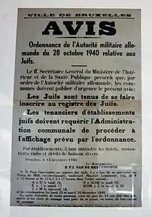 Rien de cela ne refroidit toutefois l’ardeur du Consistoire central israélite de Belgique: les soldats allemands qui assistent à l'office du grand rabbin, sont témoins d'une récitation d'une prière pour le roi, suivie de La Brabançonne entonnée par les fidèles, et qui se termine par un sermon patriotique et empli d'espoir de libération : « C’est l’indépendance que la sortie d’Égypte, que le Décalogue a apportée au monde, la liberté de penser et de croire, le droit des consciences, le droit de sentir et d’aimer selon son cœur, le droit de juger suivant sa raison. Nous sommes des êtres libres et nous avons le devoir de rester libres, de défendre, de sauvegarder notre indépendance, de ne pas la sacrifier honteusement, pour des considérations indignes de nous ». Cette attitude du culte israélite attire le courroux de l'occupant[131]. Tandis que le sionisme fait une timide progression à Bruxelles, où la communauté juive — même d’immigration récente — sera moins malmenée[129], le grand-rabbin Armand Bloch, arrêté pour patriotisme par les Allemands, devient le symbole de la loyauté juive, et ses administrés s’engagent en nombre dans la Grande Guerre[126] quand bien même ils devraient faire face à d’autres Juifs sur le front (les frères Philippson sont dans ce cas, chacun défendant avec ferveur sa patrie respective)[129] ; beaucoup en sortent décorés, en particulier Ernest Wiener[132] et le général de l'une des six divisions belges, Louis Bernheim, « petit Français d’origine juive, devenu Belge par naturalisation […] qui rendit à la Belgique des services inestimables. »[133]. Après avoir crypté les communications belges avec le « code Seligmann », Henri-David Seligmann[134] dirige la section des renseignements du Quartier général durant la guerre[104]. Le philanthrope américano-belge Dannie N. Heineman s’emploie par ailleurs à renforcer la population en négociant le Comité national de secours et d’alimentation et la Commission for Relief in Belgium, tandis que Thérèse Goldschmidt, qui se fera connaître pour ses engagements féministes et sociaux, met en place une association d’aide aux infirmières[128], qu'Alfred Loewenstein fournit l'armement à l'armée belge depuis Londres[56], et que la Belgique demande à Salomon Benatar, un aventurier juif de Rhodes qui a développé la communauté juive dans les possessions belges au Congo, d’organiser le ravitaillement des troupes belges massées à la frontière avec la colonie allemande du Burundi[135]. Alfred Errera (en) s'engage comme volontaire dans l'armée et est décoré de l'ordre de la Couronne pour avoir inventé un système de repérage des batteries ennemies[136]. La plaque commémorative de la synagogue israélite de Bruxelles comporte en outre quelques noms aux consonances nord-africaines ou levantines[137] car des Juifs d’Algérie et de Turquie se sont installés à Bruxelles au tournant du siècle, les premiers fuyant les retombées de l’affaire Dreyfus tandis que les seconds semblent avoir été attirés par les opportunités qu’offre la Belgique[138].