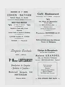 Des Juifs de France suivent les déplacements des troupes napoléoniennes, et d'autres du sud-est de la France sont réputés pour leur commerce des olives[80]. Des familles importantes arrivent ensuite d’Angleterre, d’Allemagne et de Hollande comme les Landau, Lippman, Fürth, Hirsch et Simon — ces derniers s'illustrent dans la médaillerie et la sigillographie, et Jean Henri-Simon (en) effectue des commandes pour Charles Alexandre de Lorraine ou le Duc d'Orléans avant de s’engager dans l'armée pour devenir lieutenant-colonel d'une compagnie franche. Celles de Hollande font le commerce de perles, de diamants et de pierres précieuses ainsi que de crayons et de papeterie. Celles d’Allemagne se spécialisent notamment dans la dentellerie mais aussi dans le commerce de chevaux. Au XIXe siècle, s'ajoutent les métiers de l'imprimerie et de la publicité ainsi que les métiers du domaine médical. D’anciens colporteurs ouvrent des échoppes et des magasins, d’anciens artisans montent leur entreprise de verres et cristaux, deviennent fournisseurs d'équipement militaire ou fondent une fonderie[79]. Ces changements entraînent un clivage entre une minorité d’installation ancienne, et une classe démunie qui est pour la plupart issue de l’immigration des pays avoisinants[18]. Ceux-ci vivaient entassées dans les quartiers pauvres[80] et étaient maintenus sous une surveillance policière répressive[72]. Les plus miséreux vivaient de mendicité, de colportage ou de musique ambulante[81], tout en faisant preuve de civisme, à en croire les rapports de police[82]. Marchands, on les retrouvait sur les routes et les marchés, dans les champs de foire de Bruxelles et dans les villes de province, et ils retournaient à leur foyer seulement pour le jour du repos. Une poignée s'engage dans l’armée de l'Empreur[80]. Malgré leur condition de misère, les familles juives continuent de célébrer leurs traditions, leurs rites et leurs festivités avec grande chaleur[80].