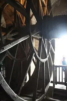 - La machine de levage elle-même est appelée grue, gruau, engin, machine ou chèvre, quelquefois aussi « tympan »[3]. Toutefois certains archéologues la nomment tour à tour « machine de levage », « machine de levage à roue motrice », « machine élévatrice médiévale », « roue de carrier »[4]. Dans la grue, le tympan est associé à une pièce de bois verticale terminée en pointe, à laquelle est attachée une flèche soutenue par des écharpes fixées par des liens de fer. Les arbres principaux de ces grues peuvent atteindre des dimensions importantes (de 15 à 16 m de hauteur, pour des flèches qui pouvaient atteindre les 12 m), si bien qu'elles réclamaient des pièces métalliques de renfort. La poulie à l'extrémité de cette flèche est munie d'un cliquet anti-retour qui évite que la charge n'inverse le sens du tambour. De la graisse et du savon étaient utilisés pour lubrifier les mécanismes. Le déplacement des hommes ou des animaux dans le tambour provoquait l'enroulement de la corde ou du câble autour de la poulie[5].