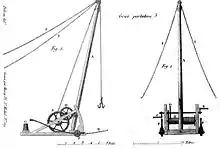 - Engin - Machine servant à élever en saillie les grosses pièces[C 4] - Machine dont on se sert pour élever des fardeaux. Il est composé d'une sole avec sa fourchette, d'un poinçon, de quatre moïses, de deux contre-fiches, d'un rocher, d'un treuil avec ses bras, d'une jambette, d'une sellette, de deux liens et d'un fauconneau ayant une poulie à chaque extrémité[M 6].
