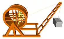 Une cage, d’un diamètre de 2 à 3 mètres, montée sur un axe qui entraîne un tambour solidaire. Sur ce tambour vient s’enrouler la corde qui tire une charge à soulever. A l'équilibre, et en négligeant les frottements des différents organes en rotation, l’effort E à fournir multiplié par le rayon R de la cage est égal au poids P multiplié par le rayon r du tambour, soit