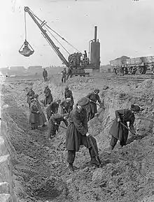 ![]() Chantier naval. Première Guerre mondiale. À l'arrière-plan, grue à vapeur sur rail. |