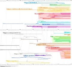 Chronologie de quelques religions, organigramme provenant de l'ouvrage de Baladier, Charles et Lapierre, Jean-Pie, (dir.), La petite encyclopédie des religions, Éditions du regard : Paris, 2000, 239 p.