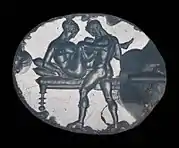 Les Grecs de l’Antiquité ont souvent peint des scènes sexuelles sur leurs céramiques, bon nombre d’entre elles étant notoires du fait qu’elles constituent les représentations homosexuelles et pédérastes les plus anciennes dont on dispose aujourd’hui. L’art grec dépeint souvent les relations sexuelles, mais il est impossible de faire une distinction sur ce qui était illégal ou immoral puisque les Grecs antiques n’avaient pas de concept de pornographie. Leur art reflète simplement des scènes de la vie quotidienne, certaines plus sexuelles que d’autres. Des phallus sont visibles dans des lieux de culte tels que le temple de Dionysos sur l’île de Délos, alors que le herma, petite statuette composée d’une tête sur un socle rectangulaire d’où se dresse un phallus, constituait un objet courant et une amulette. L’idéal masculin grec avait un petit pénis, une esthétique que les Romains adoptèrent plus tard[3],[9],[10].