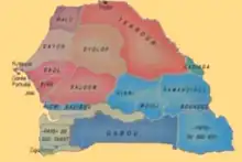 Deux autres grandes entités politiques se constituent et se développent au cours des XIIIe et XIVe siècles, l'empire du Mali et l'empire du Djolof qui va devenir le vassal du premier au moment de son apogée. Issu de l’invasion mandingue, le Mali ne cesse de s'étendre, englobant d'abord l'est du Sénégal, puis presque la totalité du territoire actuel. Fondé au XIIIe siècle par le chef wolof Ndiadiane Ndiaye[45], le Djolof élargit sa domination aux petites chefferies au sud du fleuve Sénégal (Waalo, Cayor, Baol, Sine-Saloum), réunissant tout l'espace sénégambien auquel il donne une unité sociale et religieuse : c'est le « Grand Djolof »[46] qui s'effondrera vers 1550.