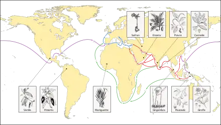 Le poivre était de très loin la principale épice à valeur marchande au moins jusqu'au XVIIIe siècle. Son commerce, ses marchés et son prix ont été sujets de très nombreuses études en histoire économique et sont analysés comme facteurs critiques de processus aussi divers que la dévaluation du système monétaire romain, l'essor de la république de Venise ou les explorations maritimes ibériques[Note 1],[4]. Aux côtés du poivre, le safran, le gingembre, la cannelle, la muscade et le girofle ont eu une grande importance économique et participent toujours au commerce international des denrées alimentaires[5]. La myrrhe et l'oliban, célèbres pour leur mention biblique comme cadeaux des rois mages à l'enfant Jésus, étaient les marchandises majeures des séculaires « routes de l'encens »[6]. D'autres épices ont fait l'objet de commerce au long cours, avant de sombrer dans l'oubli. Le mastic de Chios[7] ou le silphium de Cyrénaïque[8] comptaient ainsi parmi les produits de luxe du monde antique. Les Romains faisaient venir d'Inde à grand prix le nard, le costus, le lycium et le bdellium[9]. Pour la cuisine médiévale européenne, le galanga, le zédoaire ou les graines de paradis étaient des épices précieuses mais relativement communes[5].
