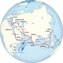 Après le retrait de l'Empire romain, le commerce de l'océan Indien est dominé par les marchands persans et arabes, et par les entrepôts malais du Srivijaya. Il s'agit de réseaux principalement privés, de faible ampleur et développés pacifiquement par des aventuriers plutôt que par des ambitions politiques étatiques. Ce système est à la fois perturbé et intensifié par la montée presque synchrone des Fatimides en Égypte (969), des Song en Chine (960) et des Cholas dans le sud de l'Inde (985)[66]. Le volume du commerce maritime entre la mer d'Arabie, le golfe du Bengale et la mer de Chine méridionale connait une croissance spectaculaire au Xe siècle, qui se maintient à un niveau élevé jusqu'au milieu du XIIIe siècle. Il traverse ensuite une période de récession, due aux troubles intérieurs tant en Chine qu'en Inde, qui perdure jusqu'au début du XVe siècle[67].