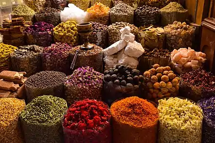 Bassorah est le premier débouché des provinces mésopotamiennes sur le golfe, avant de faiblir à la suite des rébellions des Zanj puis des Qarmates[86]. À partir du IXe siècle, c'est le port de Siraf qui devient le principal entrepôt du Moyen-Orient pour les marchandises en provenance de l'Inde, de la Chine, de l'Asie du Sud-Est, de l'Afrique de l'Est et de la mer Rouge. Il abrite une population de riches marchands qui vivent entièrement du commerce des produits de luxe, tels que les perles, les pierres précieuses, l'ivoire, les épices et l'ambre gris, et dont les boutres sillonnent tout l'océan Indien[87]. Depuis Siraf, les épices asiatiques rejoignent par voie terrestre les marchés du Moyen-Orient, dont Bagdad est le centre névralgique. Elles atteignent l'Empire byzantin à Constantinople et Trébizonde sur la mer Noire, qui est longtemps le principal centre de distribution vers l'Occident[88].