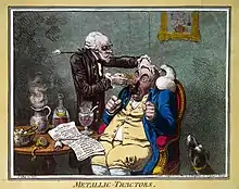 La première utilisation expérimentale documentée d'un placebo date de 1800[9] : autour de 1795-1796, le médecin américain Elisha Perkins invente les « tracteurs de Perkins », baguettes métalliques brevetées (car prétendument faites en un alliage original doté de pouvoirs de guérison) censées soulager toutes sortes de maladies (rhumatisme, maux de tête) en les passant sur les nerfs du corps atteints d'inflammations. Alors que Perkins présente ses baguettes à Londres, le médecin épidémiologiste John Haygarth (en) répète les expériences de Perkins sur des malades avec des baguettes métalliques et des baguettes en bois : il obtient des résultats identiques (quatre des cinq malades déclarent aller beaucoup mieux) avec les deux types de baguettes. Haygarth dévoile ainsi la supercherie et décrit l'effet placebo dans un ouvrage en 1800 qu'il sous-intitule De la curieuse influence de l'imagination sur les fonctions du corps humain[10].