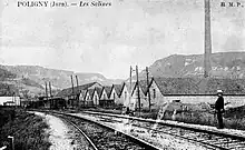 La concession minière accordée en 1894 débouche sur la construction de la saline de Poligny en 1895-1896. La production du sel commence en et atteint 4 500 tonnes en 1898, 4 100 t en 1901 et 4 051 t en 1919. Entre 1928 et 1931 le projet industriel évolue : la production de sel s'arrête et la saumure issue des nombreux forages qui se sont multipliés est entièrement acheminée à partir de 1932 par une canalisation vers l'usine Solvay de Tavaux[31]. L'approvisionnement de l'usine chimique de Tavaux est complété puis remplacé en 2007 par la saumure venue du département de l'Ain (Etrez puis Marboz).