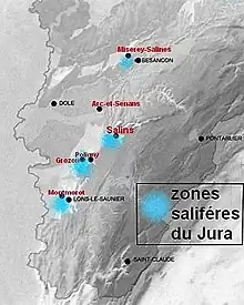 Les principaux gisements de sel gemme du massif du Jura se répartissent en trois zones prépondérantes. La zone sud est la plus importante : elle se situe en bordure des premiers contreforts du Revermont, avec deux sites principaux Lons-le-Saunier-Montmorot et Salins-les-Bains, mais également avec des gisements à Tourmont, Grozon, Poligny. Plus au nord, près de Besançon une zone moins riche s'étend de Montferrand-le-Château à Châtillon-le-Duc avec les gisements de Pouilley-les-Vignes et Miserey-Salines. Une troisième zone se trouve au nord-est de la Haute-Saône près du Doubs et du Territoire de Belfort dans le bassin houiller keupérien de Haute-Saône dans le secteur de Villersexel et de la Porte de Bourgogne (la zone a été rattachée historiquement à la principauté de Montbéliard) : on repère en particulier Saulnot, Gouhenans, Athesans-Étroitefontaine ou encore Mélecey[1].