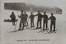 Originaires de la patrie du ski, les jeunes Norvégiens sont présentés comme « des skieurs de première force » avec une « maîtrise du ski qui leur a permis de rendre d’éminents services »[51]. De fait, les troupes de chasseurs alpins françaises évoluant à ski ont eu besoin de longues périodes d’entraînement pour maîtriser la pratique du ski en situation de combat et en terrain difficile. En 1918, les Norvégiens sont toujours la référence car les virages se font encore avec le télémark[52] :
