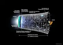 L'âge de l'Univers peut être déterminé à partir de la constante de Hubble[2]. En 2020, une estimation de celle-ci a permis d'estimer l'âge de l'Univers à 13,77 milliards ± 40 millions d'années avant le présent[3],[4],[2]. Une estimation précédente datant de 2009 donnait un âge se situant entre 13,7 et 13,8 milliards d'années[5],[6]. En pratique, on divise l’évolution de l’Univers depuis cette date jusqu'à nos jours en plusieurs ères.