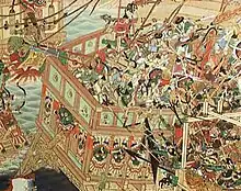 Le concept du « navire-château » décrit par Yuan Kang a continué à être utilisé dans les batailles navales chinoises après la période Han. Face à la marine de la dynastie Chen sur le fleuve Yangtsé, l'empereur Wen de Sui (581–604) employa une force navale énorme de milliers de navires et de 518 000 soldats stationnés le long du Yangtsé (du Sichuan à l'océan Pacifique)[13]. Le plus grand de ces navires avait cinq ponts superposés, pouvait contenir 800 passagers, et chaque navire était équipé de six bômes de 50 pieds (environ 15 mètres) utilisées pour se balancer et endommager les navires ennemis, avec la possibilité de les bloquer[13].