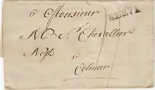 | Ville | Marque port dû | Marque port payé | Marque déboursé | Date | remarques |