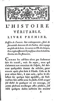 - En 1654, Nicolas Perrot d'Ablancourt publie à Amsterdam une Histoire véritable de Lucien, traduite et continuée par Perrot d'Ablancourt, qui consiste en une traduction assez libre (à la manière de son époque) à laquelle fait suite un récit imaginé par son neveu Nicolas Frémont d'Ablancourt[27], qui poursuit et achève le voyage extraordinaire laissé en suspens par Lucien.