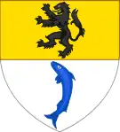 En 1558, l'écusson porte en chef, le Lion des Flandres, et en pointe, le poisson dunkerquois pâmé. Elles se blasonnent ainsi : |