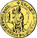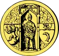 Le sceau de 1328, représente Saint Éloi assis sur un siège, tenant de la main droite un marteau levé ; de chaque côté du Saint, un petit poisson debout[2]. |