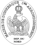 Pendant le Premier Empire, un cachet municipal fut alors adopté, rond de 35 millimètres de diamètre, et portant, dans le champ, un aigle couronné aux ailes déployées, avec les mots en légende : Mairie de Dunkerque, 1er arrondis : (Nord)."[1] Bien qu'ayant 24 175 habitants en 1806, ce qu'il lui permettait d'être une ville de seconde classe dans l'Héraldique napoléonienne, on ne retrouve aucune trace de ces armoiries. |