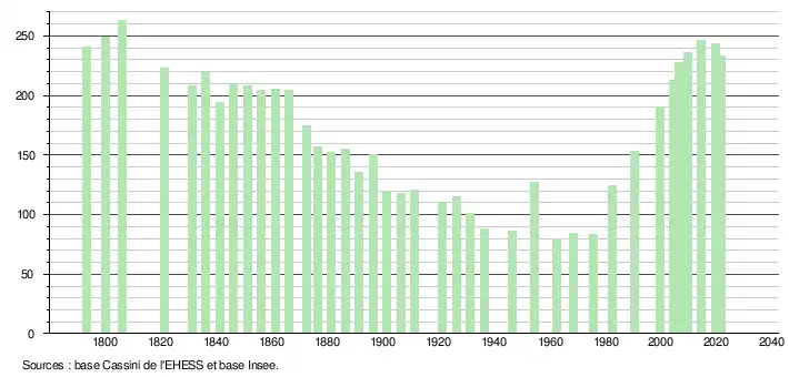 L'évolution du nombre d'habitants est connue à travers les recensements de la population effectués dans la commune depuis 1793. Pour les communes de moins de 10 000 habitants, une enquête de recensement portant sur toute la population est réalisée tous les cinq ans, les populations légales des années intermédiaires étant quant à elles estimées par interpolation ou extrapolation[28]. Pour la commune, le premier recensement exhaustif entrant dans le cadre du nouveau dispositif a été réalisé en 2004[29].