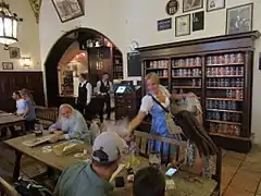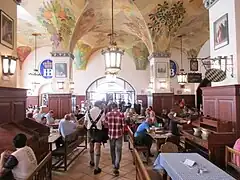 Ce haut lieu de culture populaire allemande traditionnelle, et de tourisme international, sert toute la journée en continu de la cuisine bavaroise, choucroute, saucisse allemande, Bretzel..., et des Maß / chopes de bière traditionnelles d'un litre (Hofbräu München, Helles...), dans une ambiance festive conviviale de taverne traditionnelle (jusqu'à 5 000 convives les soirs de grande affluence, jusqu'à 35 000 cumulés par jour, et quatre millions de personnes par an). Les convives portent parfois les habits bavarois traditionnels lederhose et dirndl. La tradition veut que l'on trinque, de table en table, pour se souhaiter « santé », dans une ambiance d'orchestre de musique traditionnelle bavaroise.