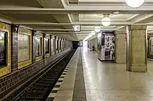 Les murs de la station présentent une base en céramique brun foncé. Au-dessus, des pilastres couronnés de chapiteaux en carrelage gris-violet encadrent des parois en céramique jaune qui portent le nom de la station et d'anciens panneaux d'affichage, qui sont maintenant ornés d'images du château de Hohenzollern réalisées par le photographe Edgar Herbst[2]. Le plafond repose sur des piliers rectangulaires en granit au milieu du quai central. Il présente une double enfilade de caissons ornés de moulures en plâtre et d'incrustations de mosaïque bleu-or, au centre desquels tombent des lampes sphériques[2].
