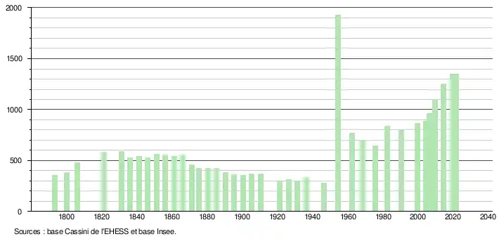 L'évolution du nombre d'habitants est connue à travers les recensements de la population effectués dans la commune depuis 1793. Pour les communes de moins de 10 000 habitants, une enquête de recensement portant sur toute la population est réalisée tous les cinq ans, les populations légales des années intermédiaires étant quant à elles estimées par interpolation ou extrapolation[16]. Pour la commune, le premier recensement exhaustif entrant dans le cadre du nouveau dispositif a été réalisé en 2004[17].