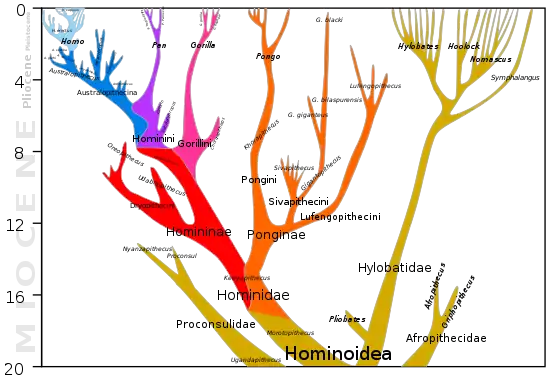 Vers la fin du Miocène inférieur, partant d'Afrique, certains groupes d'hominoïdes vont coloniser l'Asie et l'Europe, formant notamment les Hylobatidae et les Hominidae, puis ces derniers vont se subdiviser à leur tour en Ponginae (en Asie) et Homininae (en Afrique et en Eurasie).