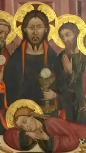Dans les évangiles canoniques, le disciple que Jésus aimait (ho mathētēs hon ēgapā ho Iēsous) est anonyme, mais il est traditionnellement identifié comme Jean de Zébédée, apôtre et réputé auteur d'un évangile, depuis Irénée, évêque de Lyon au IIe siècle. L'existence du disciple est remise en question par les spécialistes, car cette figure du disciple parfait ne serait que le modèle pour tout chrétien. Si l'Évangile selon Jean n'est qu'une œuvre à plusieurs mains, deux versets insistent pour qu'on croie en une existence réelle[23]. Ce disciple se penche sur la poitrine de Jésus et demande qui va le trahir[Bible 2] ; il est devant la Croix avec Marie de Nazareth, et Jésus fait de chacun la mère et le fils de l'autre[Bible 3] ; il va au tombeau vide le matin de Pâques[Bible 4] ; et est présent lorsque Jésus se montre post mortem à ses disciples[Bible 5].