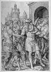 « L’homme, l’ancien, dit : « Paix à toi ! À moi seul toute ta pénurie ! Seulement ne nuite pas sur la place. » Il le fait venir dans sa maison et donne du fourrage aux ânes. Ils se lavent les pieds, mangent et boivent. Comme ils font du bien à leur cœur, voici, les hommes de la ville, des hommes, des Benéi Belia’al, cernent la maison, tapent contre la porte, et disent au maître de la maison, l’ancien, pour dire : « Fais sortir l’homme qui est venu dans ta maison. Nous le pénétrerons ! » L’homme, le maître de la maison, sort vers eux. Il leur dit : « Non ! Mes frères, ne faites donc pas le mal ! Après que cet homme est venu vers ma maison, vous ne ferez pas cette vilenie ! Voici ma fille, la vierge, et sa concubine. Je les ferai donc sortir. Violentez-les, faites-leur comme bien à vos yeux. Mais à cet homme ne faites rien de cette vilenie. » Les hommes ne consentent pas à l’entendre. L’homme saisit sa concubine et sort vers eux, dehors. Ils la pénètrent, la taraudent toute la nuit, jusqu’au matin, et la renvoient à la montée de l’aube. La femme vient au tournant du matin. Elle s’évanouit à l’ouverture de la maison de l’homme, là où était son maître, jusqu’à la lumière. Son maître se lève le matin. Il ouvre les portails de la maison. Il sort pour aller sur sa route. Et voici, la femme, sa concubine, était affalée à l’ouverture de la maison, ses mains sur le seuil. Il lui dit : « Lève-toi ! Allons ! » Pas de réponse. Il la prend sur l’âne. L’homme se lève et va vers son lieu. »