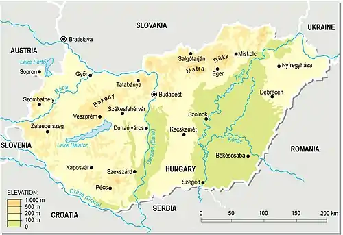 La Hongrie présente une altitude moyenne de 200 mètres. Bien qu'il existe quelques sommets montagneux, seuls 2 % du territoire national dépassent les 300 m d'altitude. Le point culminant de la Hongrie est le Kékes dans les monts Mátra qui culmine à 1 014 mètres. Le point le plus bas est situé à Csongrád-Csanád près de la rivière Tisza à 77,6 m de hauteur. Les principales rivières du pays sont le Danube et la Tisza, dont 444 km sont navigables. Les affluents mineurs du Danube se trouvent aux abords de la frontière croate : il s'agit de la Drave, du Raab, du Someș, du Sió et de la frontière slovaque : l'Ipeľ.