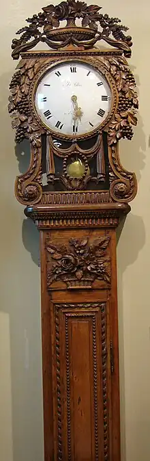 Le mécanisme petit et plat laisse la possibilité de fabriquer des coffres extrêmement long et fins. Ils sont généralement en chêne, orme ou sapin. Les décors sont très présents et évoluent en fonction des époques. Le modèle le plus courant représente une corbeille de fleurs au sommet de l’horloge, de nombreuses fleurs et végétaux assortis ornent alors le cadran et le corps. Dans la deuxième moitié du XIXe siècle, un vase sur piédouche remplace la corbeille. On retrouve aussi dans ces horloges les motifs classiques de l'art populaire normand : colombes bec à bec, symboles d'amour et de mariage, le blé et la vigne, symboles de prospérité, ainsi que des motifs plus politiques : bonnet phrygien, aigle impérial de Napoléon etc.