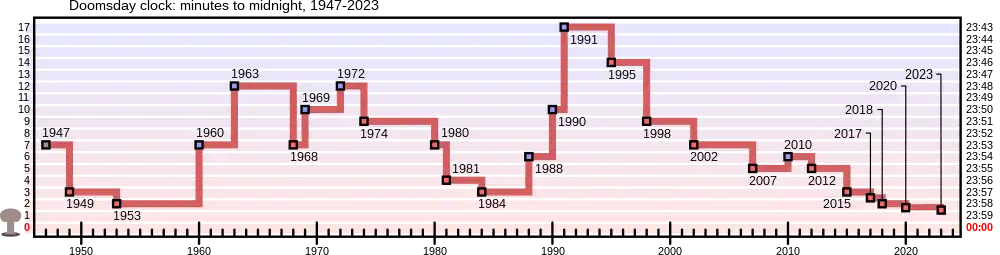 | 7 | 23 h 53 | +5 | L'horloge est reculée, en réponse à une coopération scientifique accrue et à la compréhension du public envers les dangers de l'arme nucléaire[2]. | ||