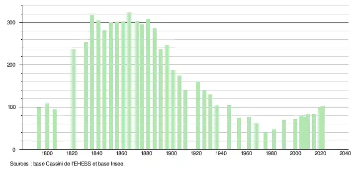 L'évolution du nombre d'habitants est connue à travers les recensements de la population effectués dans la commune depuis 1793. Pour les communes de moins de 10 000 habitants, une enquête de recensement portant sur toute la population est réalisée tous les cinq ans, les populations légales des années intermédiaires étant quant à elles estimées par interpolation ou extrapolation[21]. Pour la commune, le premier recensement exhaustif entrant dans le cadre du nouveau dispositif a été réalisé en 2004[22].