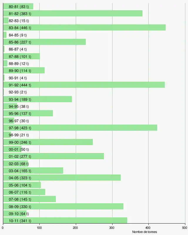 | Production | entre 2 tonnes (1992-1993) et 446 tonnes (1983-1984) |