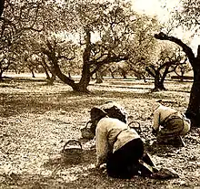 La cueillette des olives se fait du mois de décembre au mois de mai. Au début du XXe siècle, dans les grandes propriétés en Balagne ou dans le Nebbiu, il était fait appel à une main-d'œuvre étrangère lorsque la main d'œuvre féminine locale ne suffisait pas. Par contre, dans les petites oliveraies familiales, les filles de la maison suffisaient souvent à ramasser tous les matins les olives tombées la nuit au pied des arbres[8]. La récolte ne débute que lorsque les fruits ont atteint leur totale maturité[4]. Les olives sont cueillies noires afin de perdre amertume et ardance[13],[3].