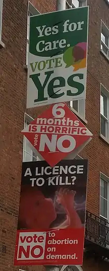 Le huitième amendement de la Constitution de l'Irlande, adopté en 1983, reconnaît le droit égal à la vie de la mère et de l'enfant à naître[1].
