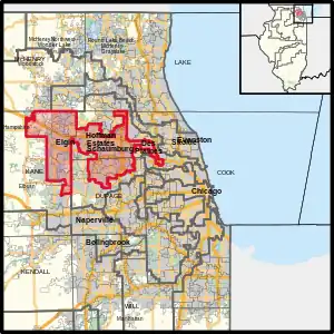 Le district couvre des parties du Comté de Cook , du Comté de DuPage et du Comté de Kane, à partir du redécoupage de 2011 qui a suivi le recensement des États-Unis de 2010. Tout ou partie d'Addison, Arlington Heights, Barrington Hills, Bloomingdale, Carol Stream, Carpentersville, East Dundee, Elgin, Elk Grove Village, Glendale Heights, Hanover Park, Hoffman Estates, Lombard, Palatine, Rolling Meadows, Roselle, Schaumburg, South Elgin, Streamwood, Villa Park et Wood Dale sont inclus[1]. Ces limites sont entrées en vigueur le 3 janvier 2013.