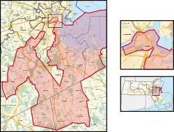 Dans le Comté de Norfolk : Avon, Braintree, Canton, Cohasset, Dedham, Holbrook, Milton (Quartiers 2 à 4 et 6 à 9), Norwood, Quincy, Stoughton, Walpole, Westwood et Weymouth.